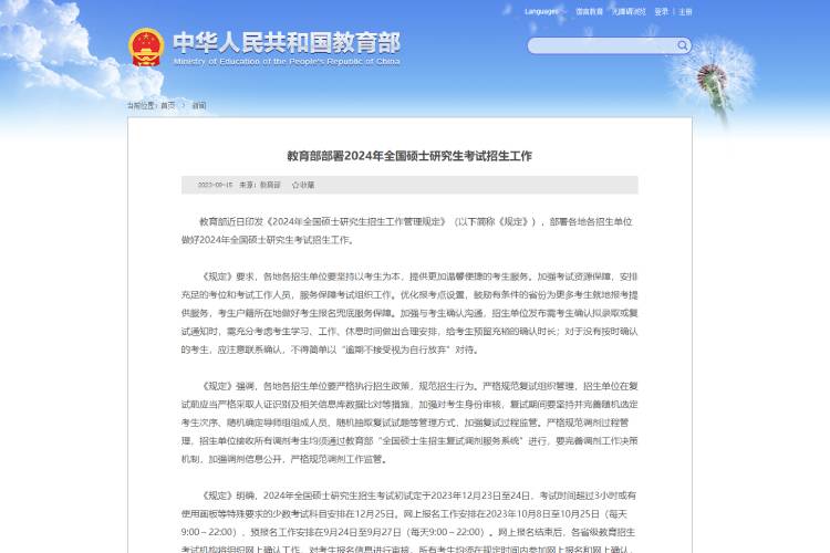 教育部近日印發(fā)《2024年全國碩士研究生招生工作管理規(guī)定》(以下簡稱《規(guī)定》),部署各地各招生單位做好2024年全國碩士研究生考試招生工作。
