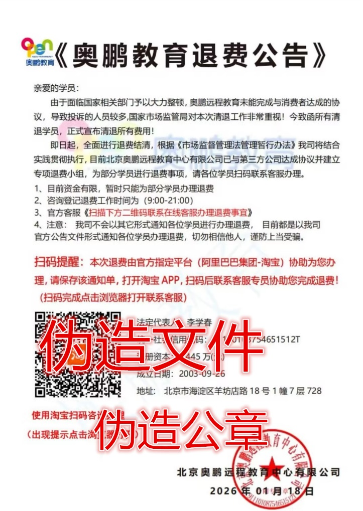 1.奧鵬教育從未與任何個(gè)人或第三方機(jī)構(gòu)成立“退費(fèi)小組”就“學(xué)生退費(fèi)”開展合作。該虛假信息中涉及到與奧鵬教育相同或相近的商標(biāo)、印章、名稱、網(wǎng)址、APP、工作人員及相關(guān)群組等均為不法分子假冒或仿冒,與奧鵬教育無任何關(guān)聯(lián),純屬不法分子進(jìn)行的詐騙行為,我們?cè)俅翁嵝褜W(xué)生當(dāng)心“退費(fèi)”詐騙陷阱。
